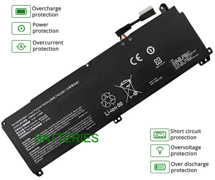 - Notre batterie TUXEDO V360BAT-4-73 contient des cellules de batterie de qualité A pour assurer une durée de vie de la batterie plus longue et plus de cycles de charge.